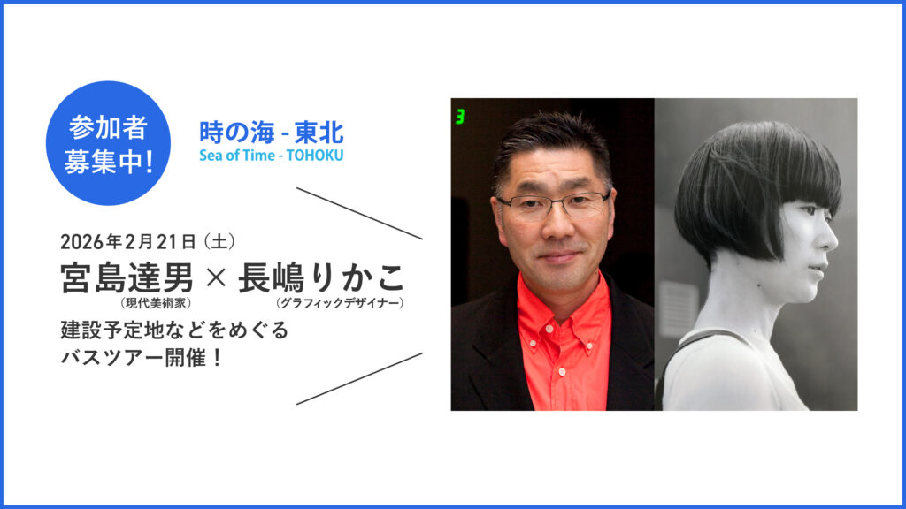 2026年2月21日(土)に、現代美術家・宮島達男とグラフィックデザイナー・長嶋りかこと共に、福島県富岡町に生まれる《時の海 – 東北》美術館(仮称)の建設予定地などをめぐる日帰りバスツアーを開催します!